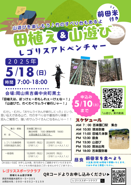 【5/18(日)レゴリスアドベンチャー田植え&山遊びの大冒険】🌾「田植えは、ぼっけぇーおもしれぇーけぇなー!」⛰「山遊びで、わくわくサムライ修行じゃー!」 むかし・むかし、おサムライさんが修行しとったという言い伝えのある山で…🎋竹のすべり台!🏕基地づくり!そして…🎉76歳も楽しめるアスレチックまで体験できるんじゃー!
